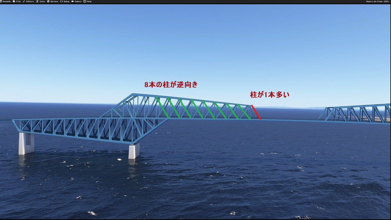 もう一つは橋脚側面の柱8本が逆向きに設置されてて (緑の斜め線が正しい方向)、更に先端の柱 (赤い線)が 一本多いんです。